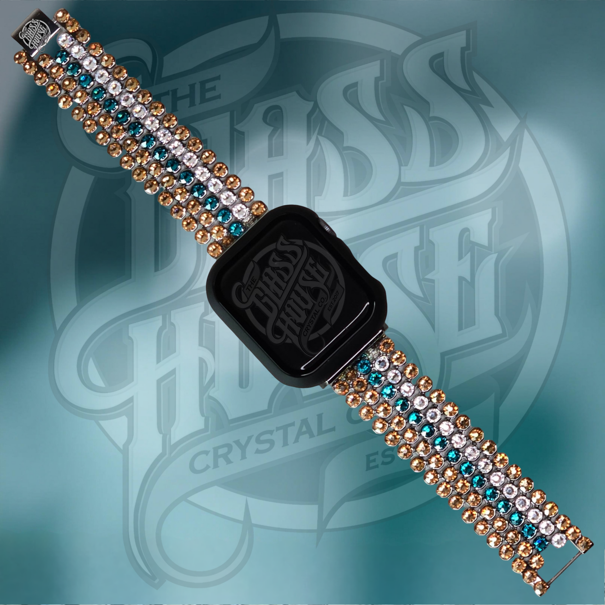 Bring the heat and the hustle with the Jacksonville Football watchband — a game day essential that captures the energy of Florida football. Featuring a golden-toned crystal background with an off-centered stripe in vibrant teal and brilliant clear accents, this design reflects the fierce pride and fearless spirit of Jacksonville’s gridiron faithful.