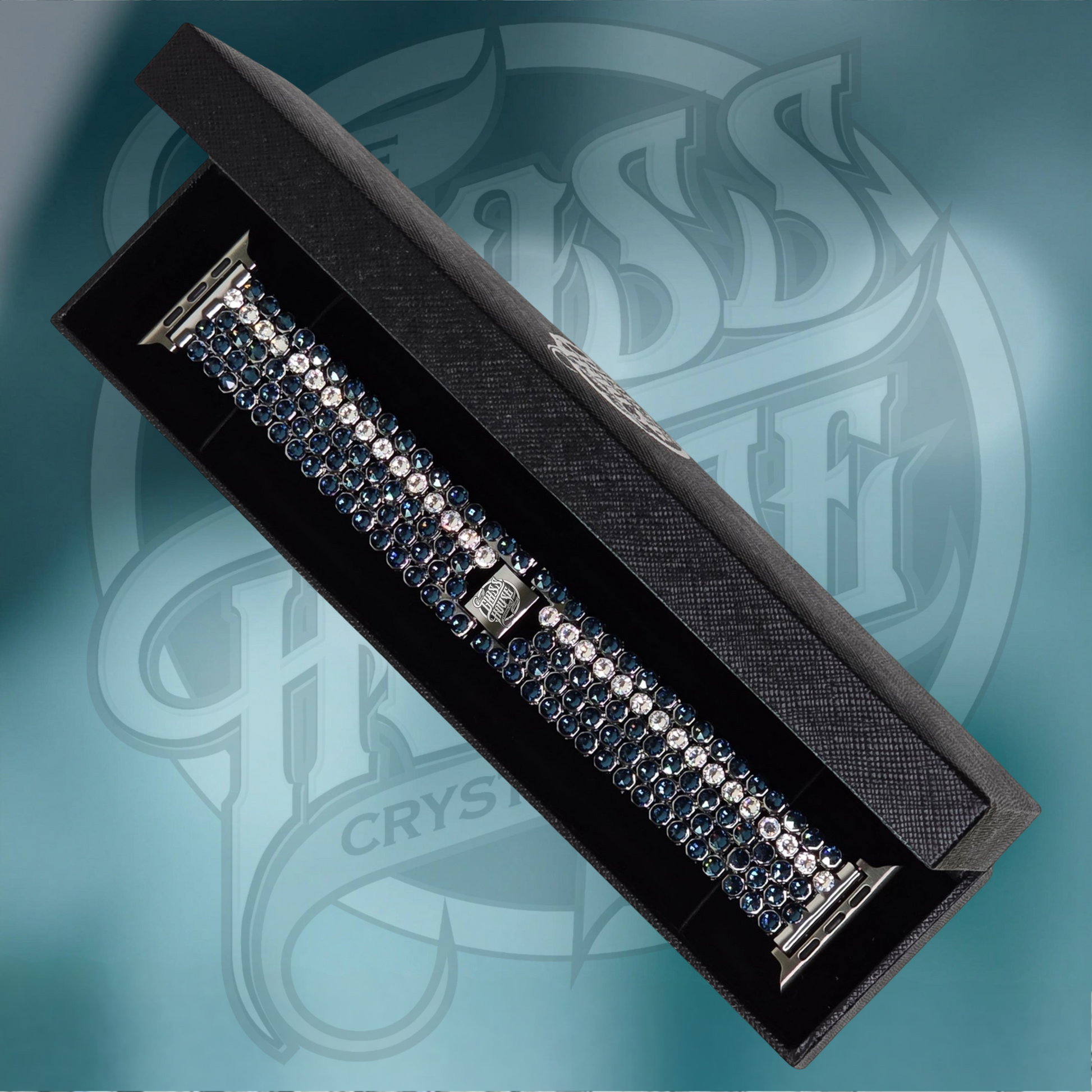 Hand-set Austrian crystals: bold blue background with off-centered silver-inspired stripe