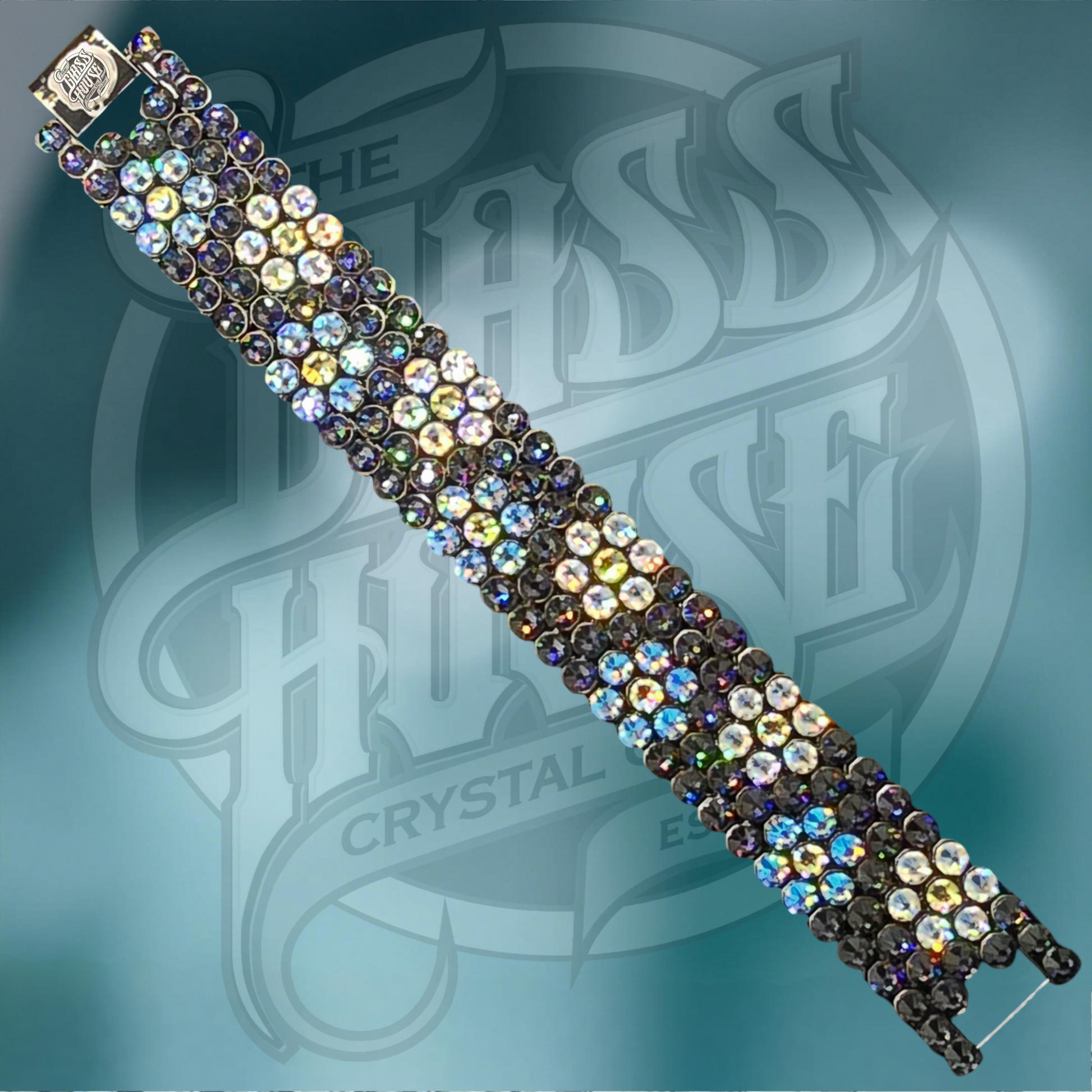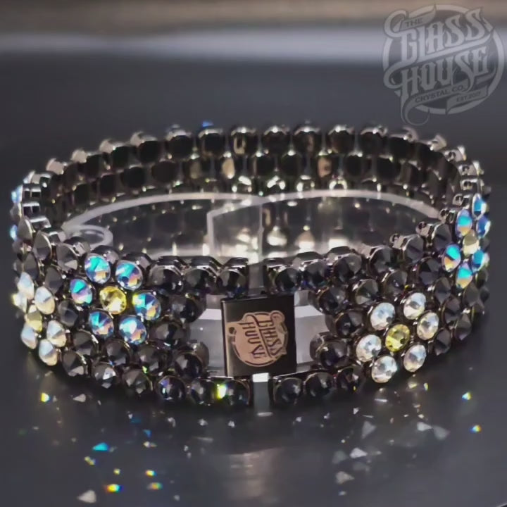 Set on a deep graphite background, this piece features delicate floral motifs in Light Sapphire Shimmer, Moonlight, and Jonquil—each crystal chosen by her, in the moment, when she saw them sparkle in person. The result is a bracelet that feels joyful, soft, radiant, and strong—just like her.