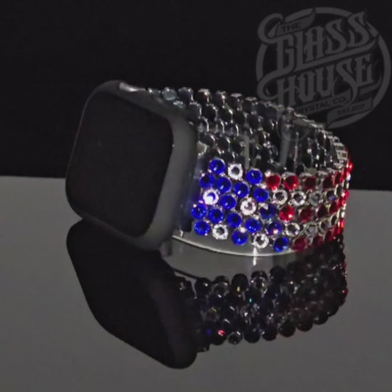 Bold, brilliant, and unapologetically patriotic, the Old Glory watchband is a sparkling tribute to the American spirit. Designed to resemble the iconic stars and stripes of the U.S. flag, each side features hand-set crystals in rich blue, vivid red, and radiant clear — a timeless symbol of courage, unity, and pride.
