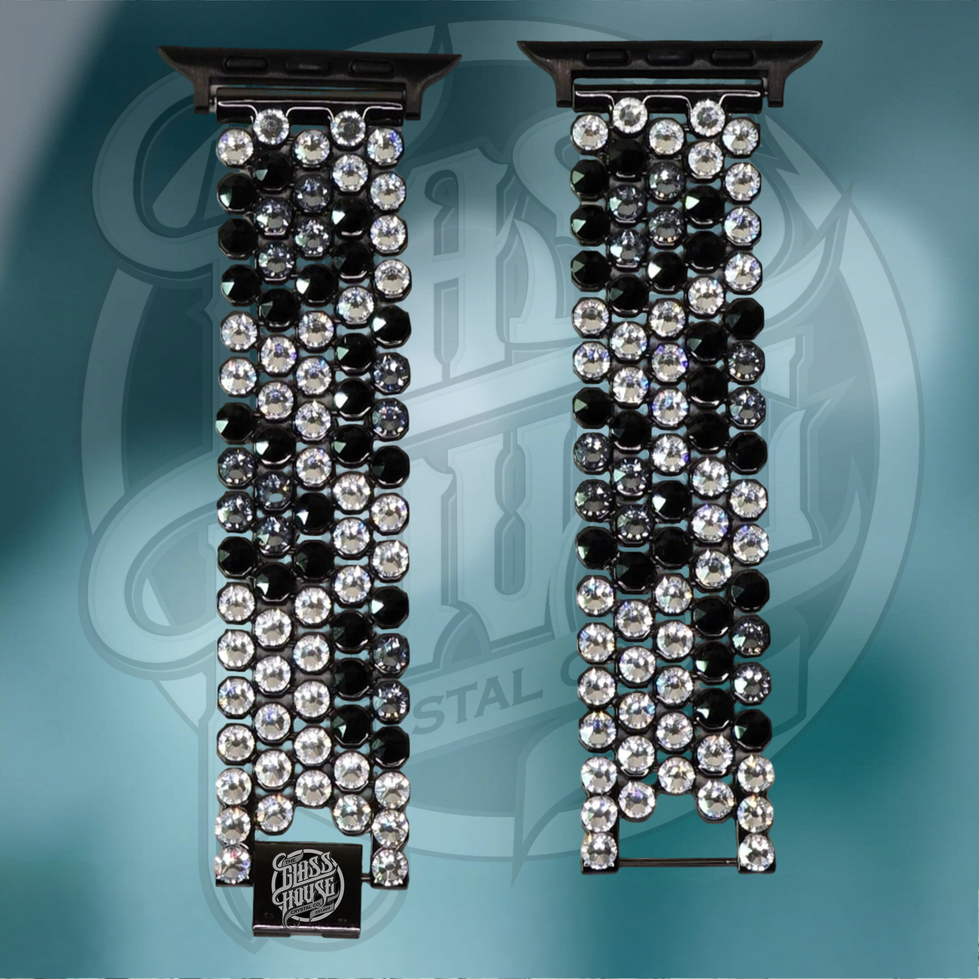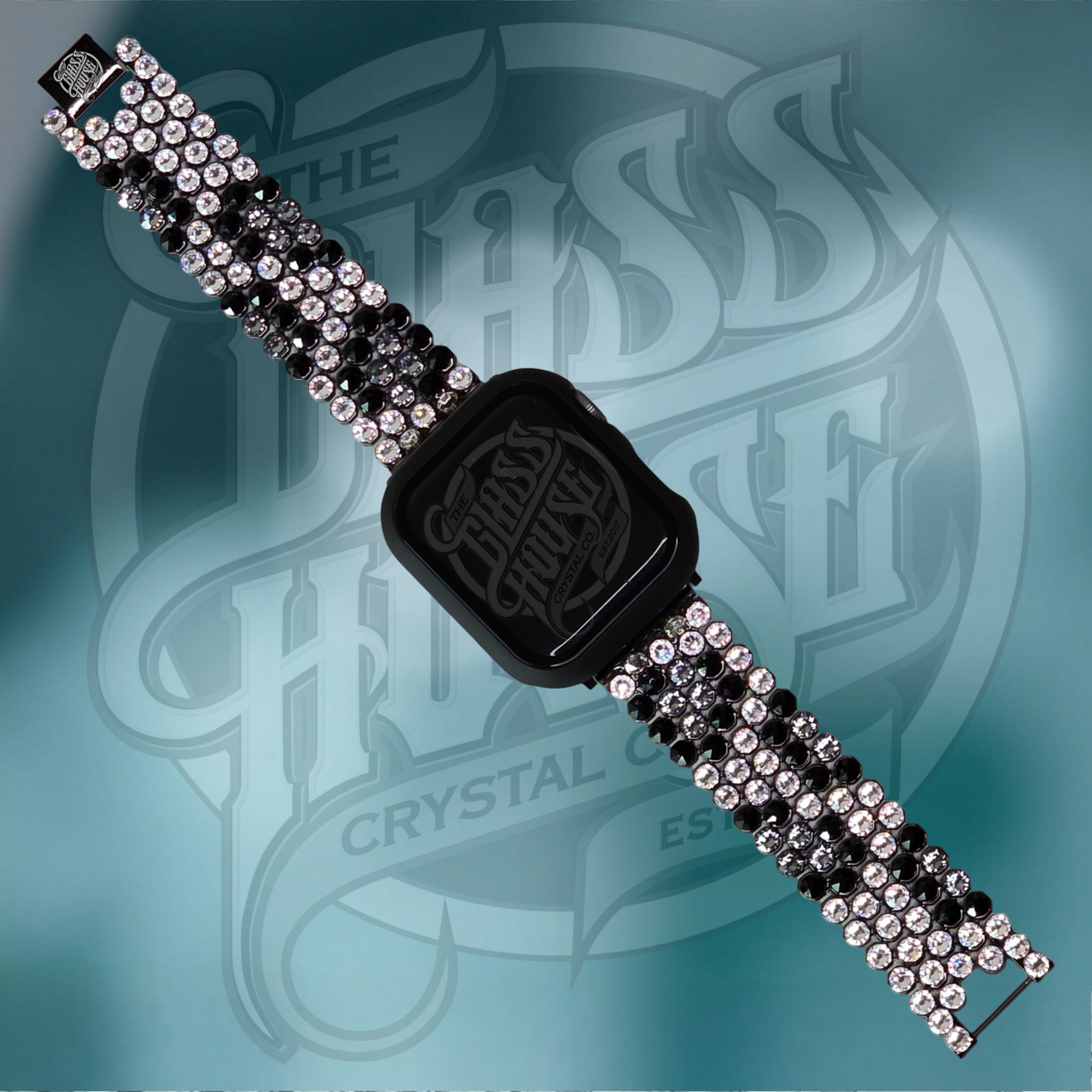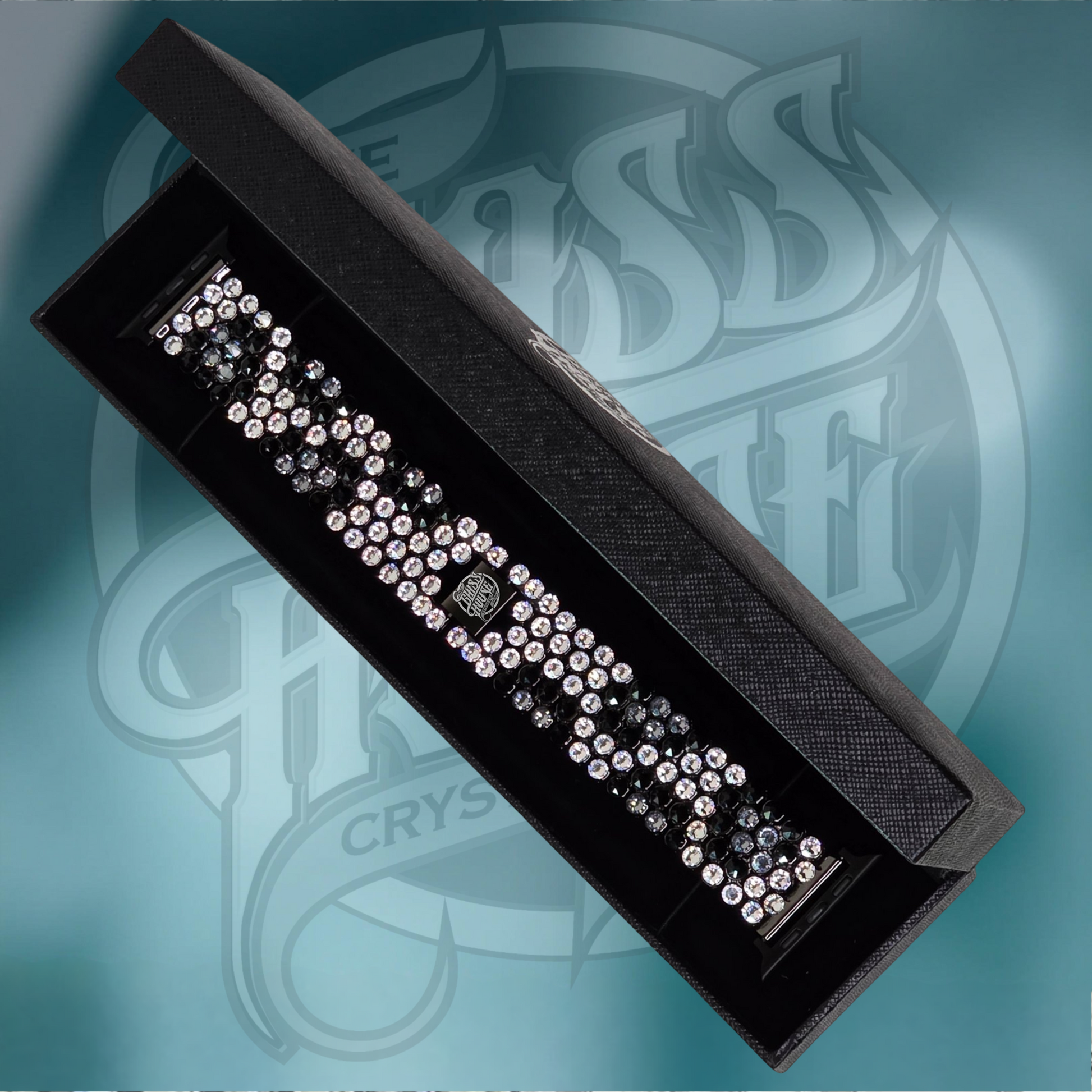 Hand-set Austrian crystals: icy clear base, stormy grey spots, and bold black edging
