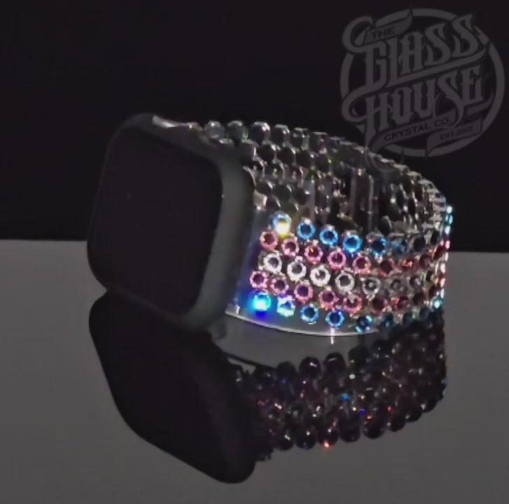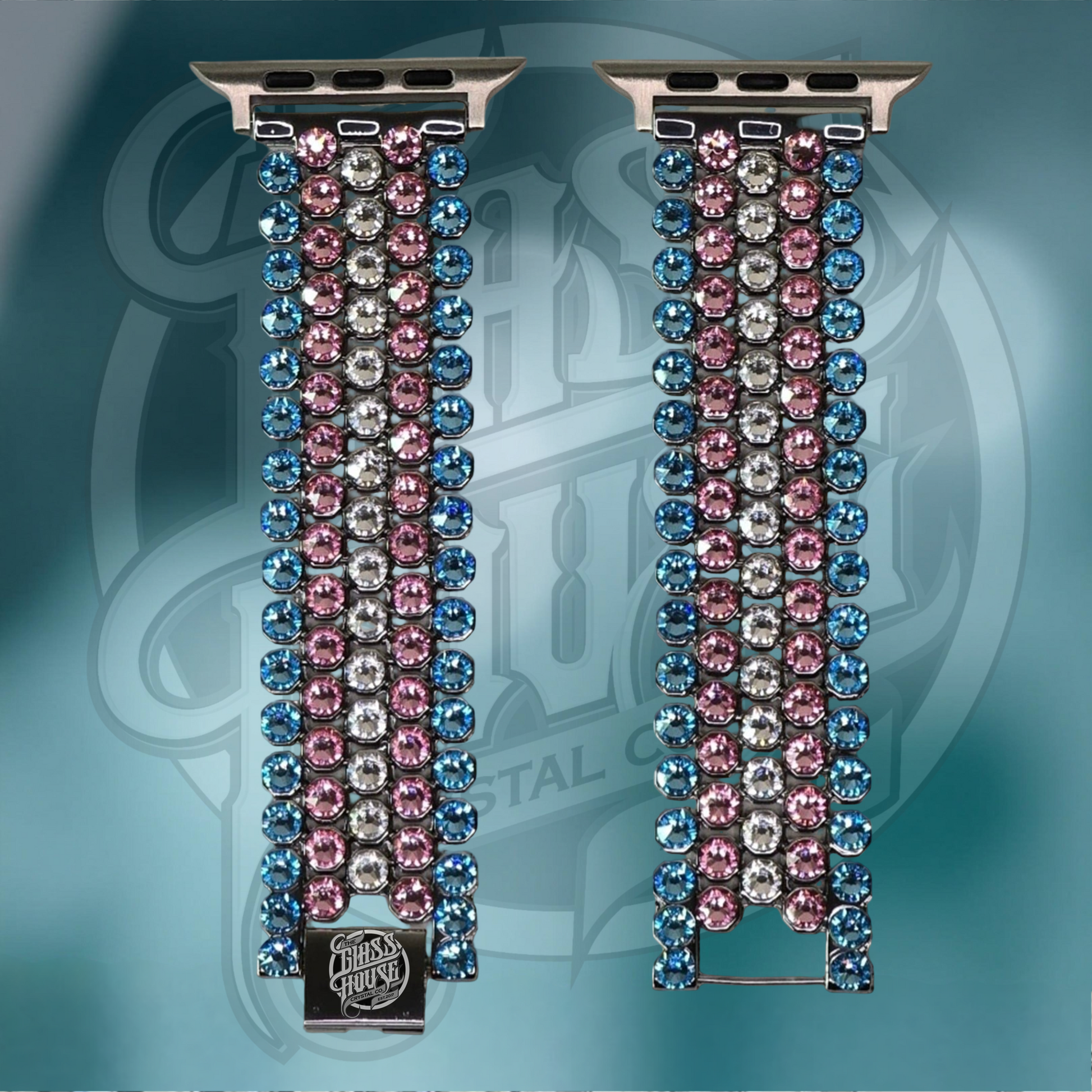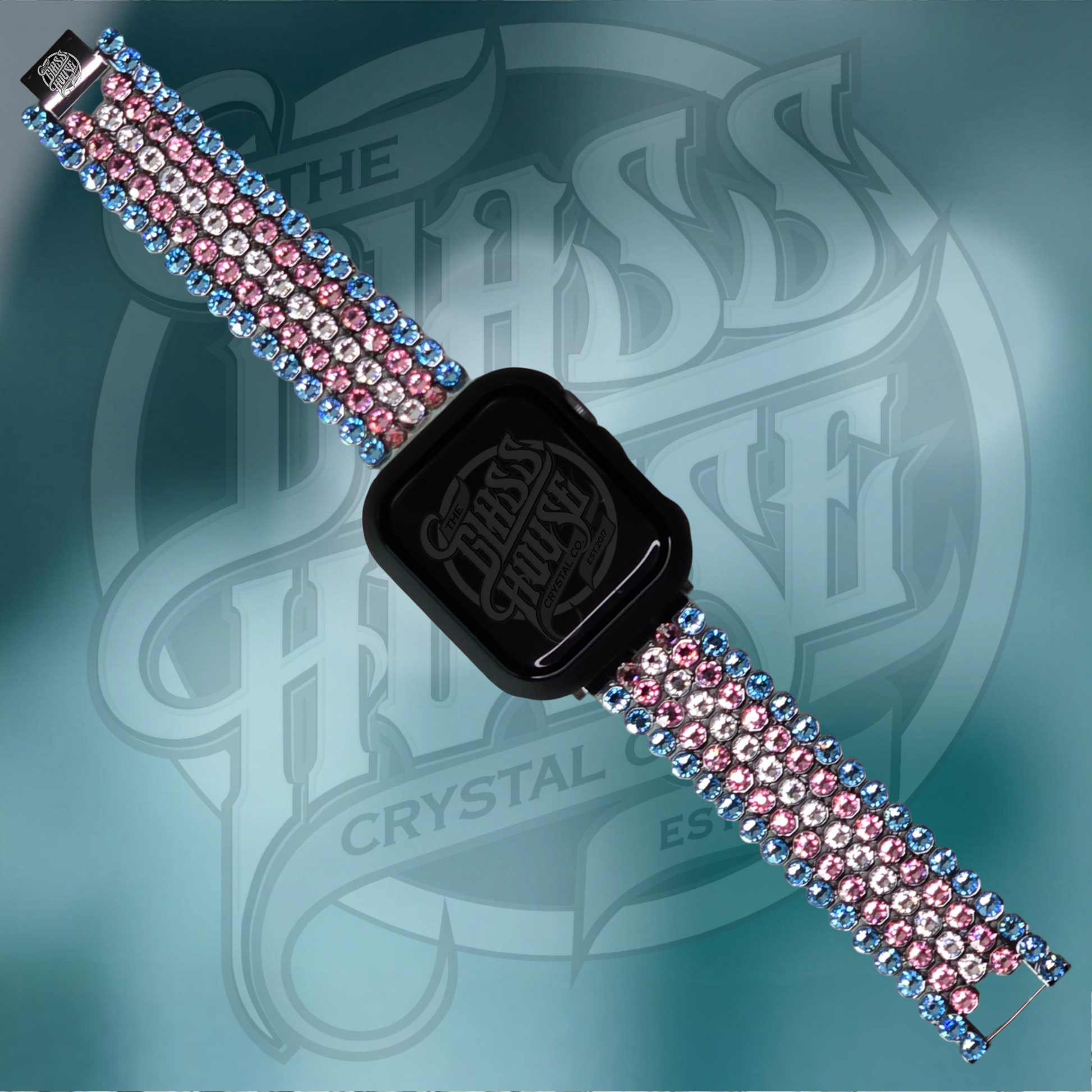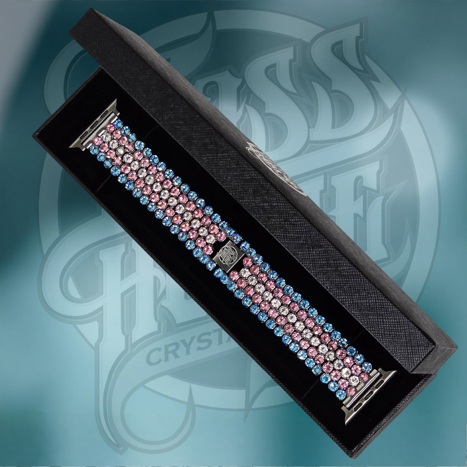 Designed as a tribute to authenticity, resilience, and inclusion, the Trans Pride watchband proudly reflects the colors of the Trans Pride flag in a radiant, hand-set crystal design. With soft pastels in light pink and blue, balanced by crisp white accents, this piece symbolizes the journey of becoming — and the courage it takes to live boldly and unapologetically.