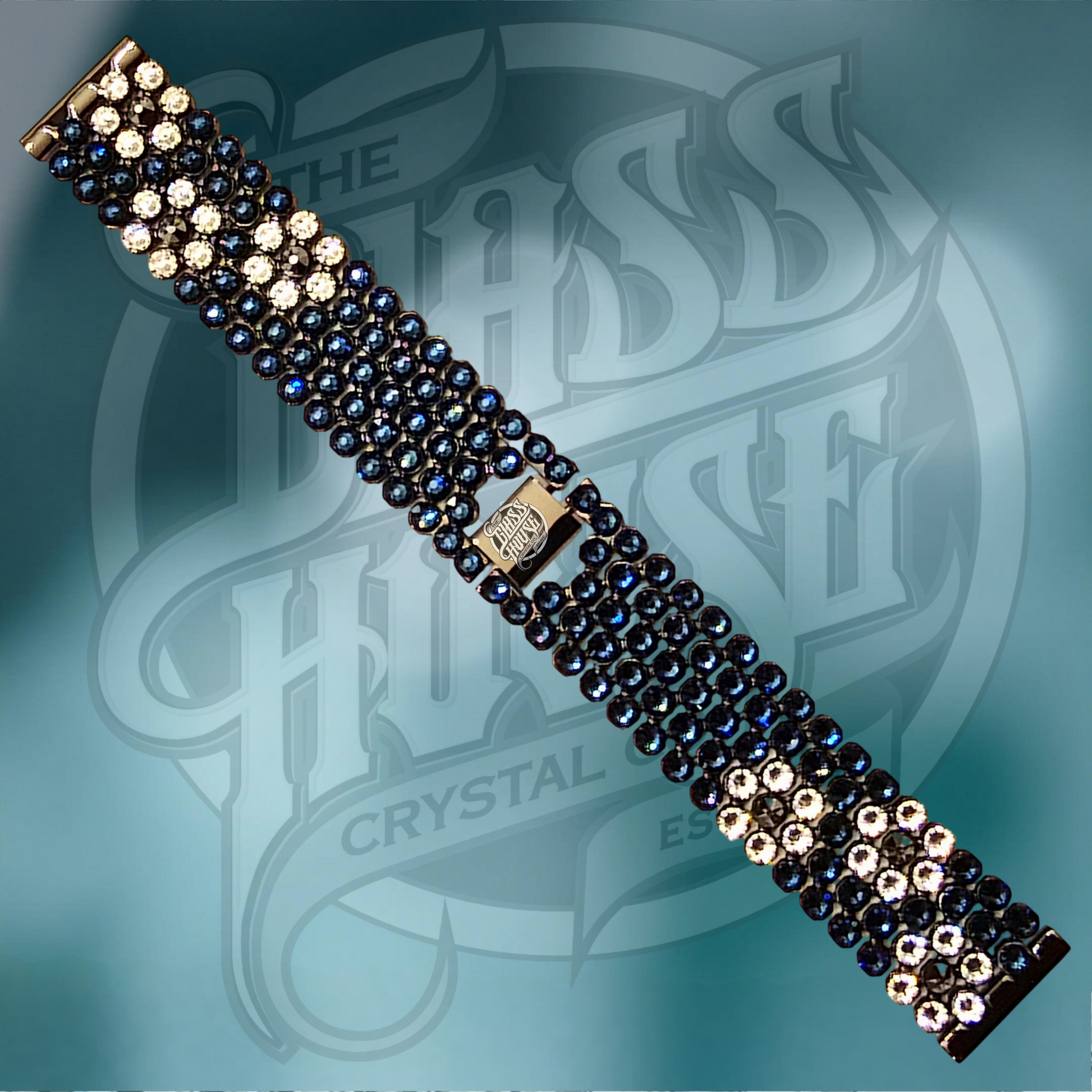 Hand-set Austrian crystals in Alzheimer’s awareness-inspired tones